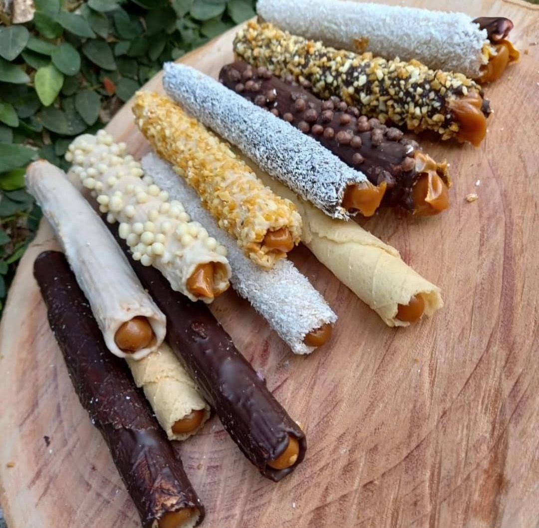 18 cm bañados en chocolate blanco o negro y rellenos de dulce de leche. Toppin, crocante, cereal, coco, rockler, solo baño.